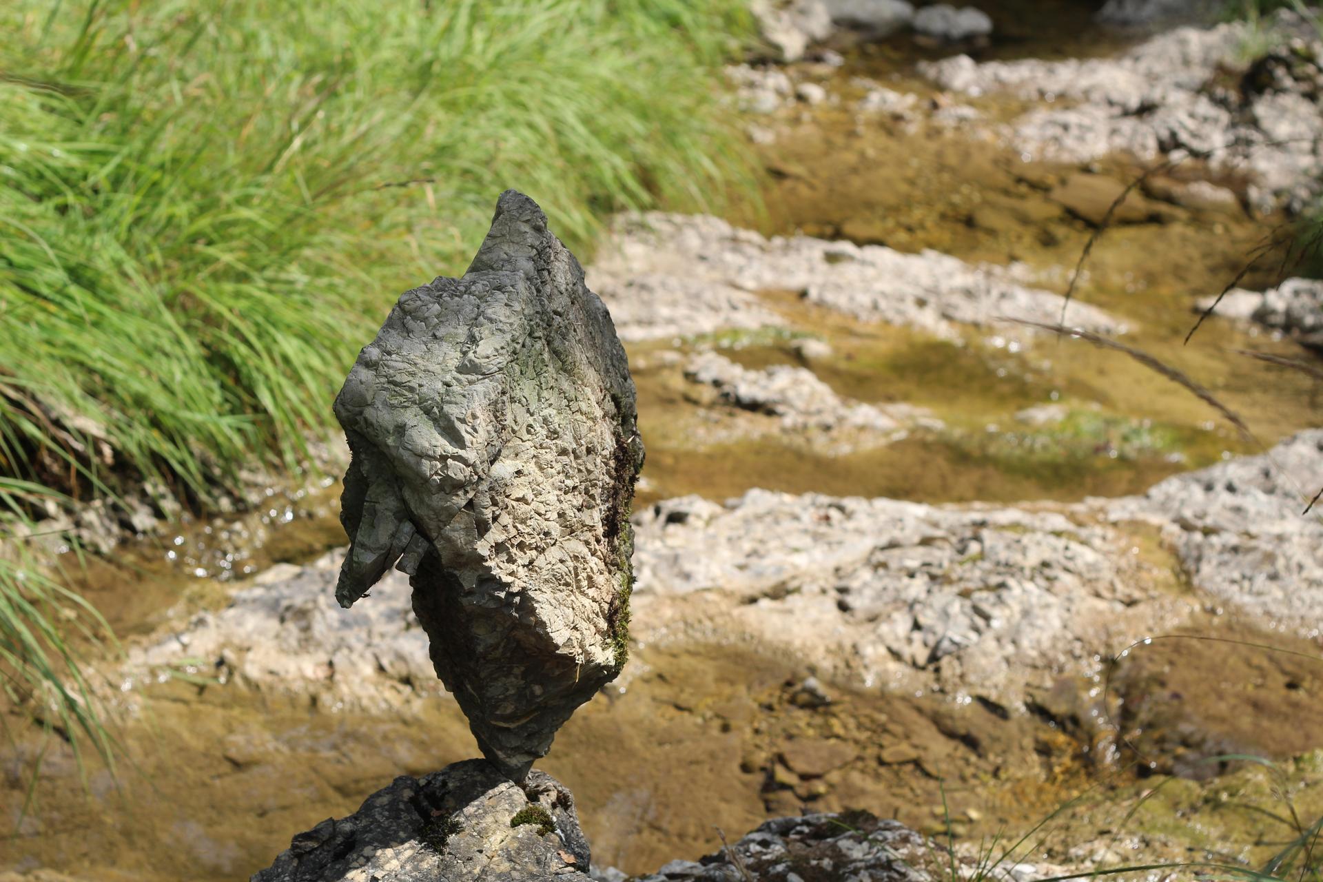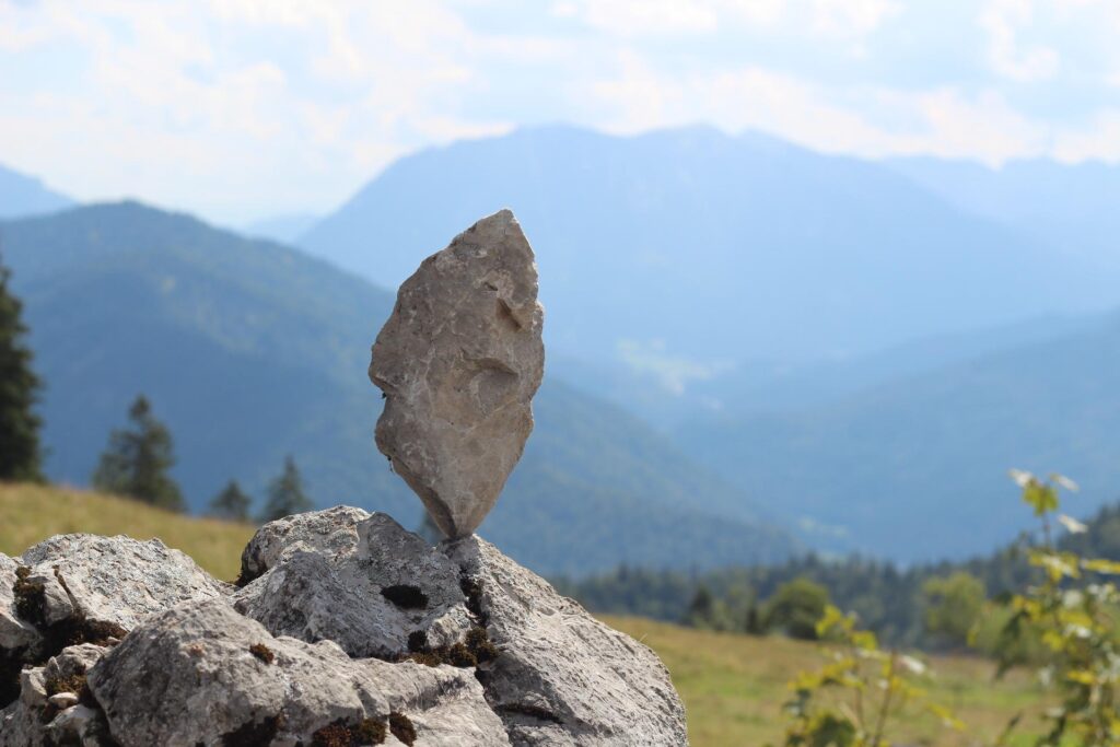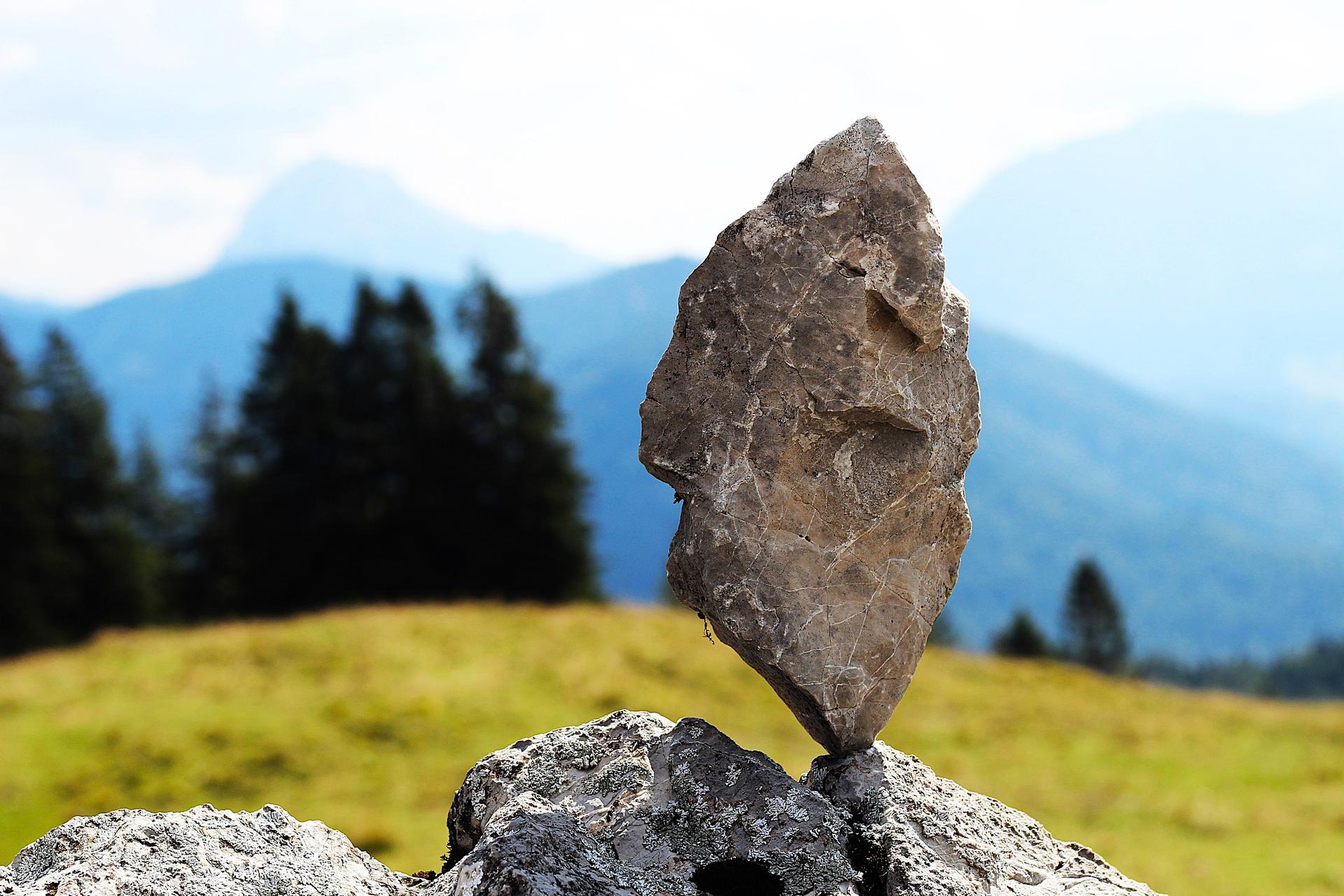 August 2022: Kreuth, am südlichsten Ende Deutschlands, Glashütte, hoch oben auf der Alm; auf einer einsamen Wiese steht ein Mann in der gleißenden Mittagssonne und wuchtet einen schweren Stein von hier nach dort, auf einen Felsen, setzt in dort ab, stellt ihn auf seine Spitze, richtet ihn aus, und: lässt los. –
